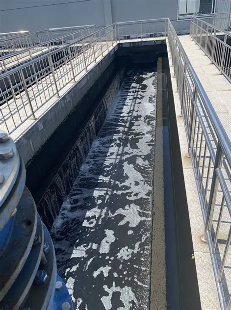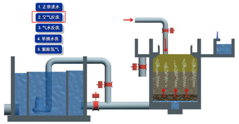 開啟反(fǎn)衝洗空氣閥,通過底(dǐ)部布氣係(xì)統向濾料層通入空氣,利用空氣(qì)的攪拌作用,使濾料(liào)顆粒相互摩擦、碰撞,鬆動濾料層(céng),將(jiāng)附著在濾料表麵的汙泥、老化生物膜初步剝離,此階段一般持續 3-5 分鍾(zhōng)。