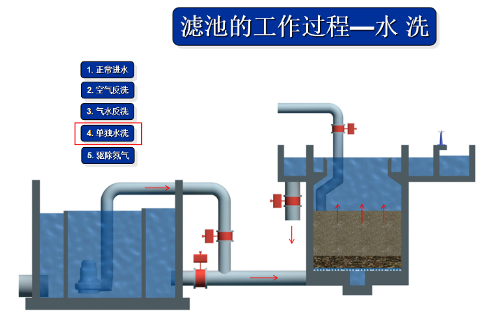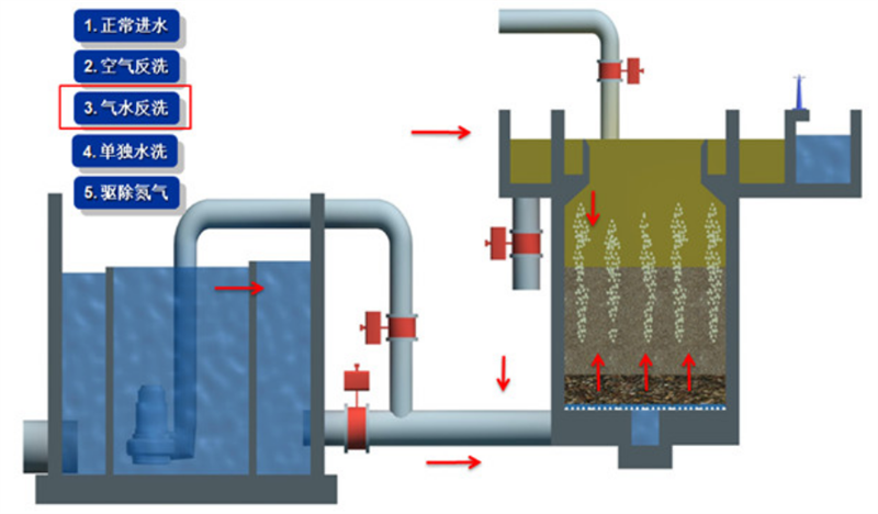 2. 反衝洗過程:在反衝洗時,關閉進水閥,部分進水通過常開的方(fāng)孔流入濾池,形成表麵掃(sǎo)洗。反衝(chōng)洗分為(wéi)氣衝、氣水聯衝和水衝(chōng)三個階段,確保濾料表(biǎo)麵(miàn)的雜質被有效(xiào)清除