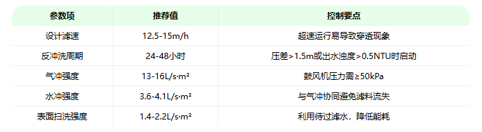 在持續氣衝的同時,開啟反衝洗水閥,通過(guò)底(dǐ)部布水係統通(tōng)入(rù)反衝洗水。氣、水共同(tóng)作用下,進一步強化濾料的擾動和摩擦效果(guǒ),將剝離的汙染物(wù)衝刷懸浮於水中,此階段通常持續(xù) 4-6 分鍾。
