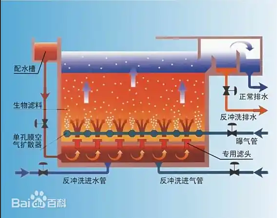 特點:占地麵積小,處理效率高,生物膜活性高,抗衝擊負荷能力強(qiáng);集生物氧化和過濾於一體,簡化了處理流(liú)程;濾料可截留汙水中的懸浮物,減少後續處理單元的負荷;但需(xū)要定期(qī)反衝洗,以去除濾層內的生物膜和(hé)截(jié)留的雜質。